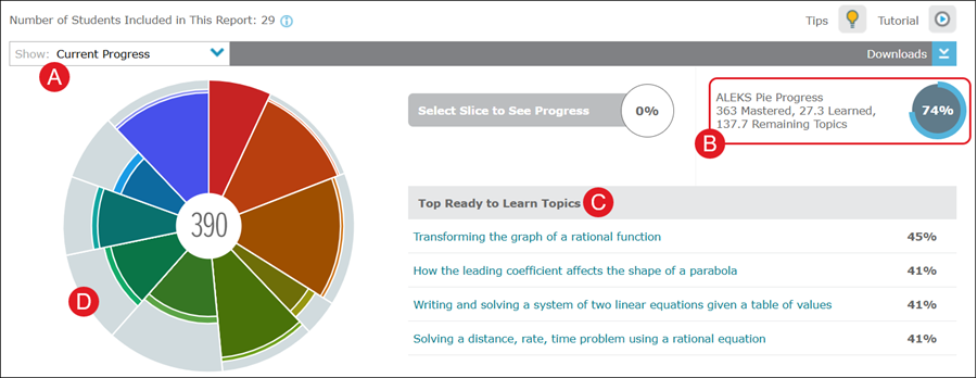 A. The default view of the Pie Report, and the one used most often is, Current Progress, as it's designed to give real-time information about what students are ready to learn.