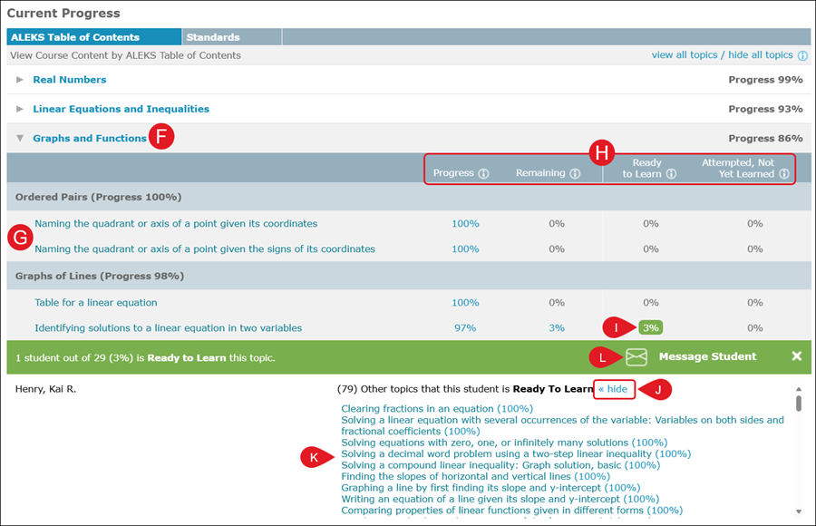 J. In the Ready to Learn column, click the Show/Hide to expand/collapse the list of additional topics the listed students are set to learn.