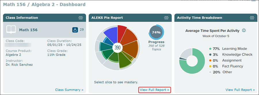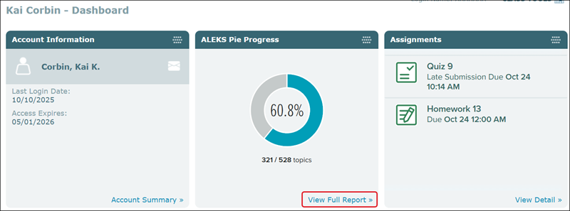 You can also click the View Full Report link on the student's ALEKS Pie Progress tile on the Dashboard.