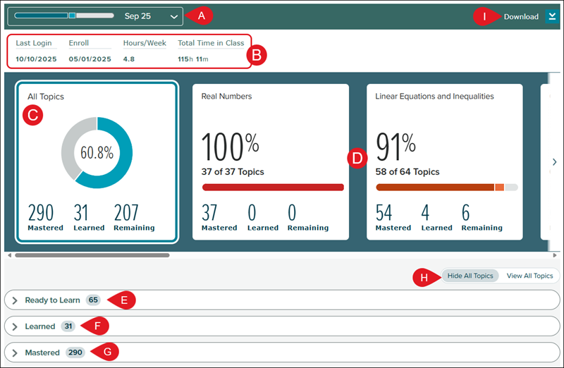 G. Mastered means the student has demonstrated consistent mastery of these topics in the Learning Mode and/or Knowledge Checks.