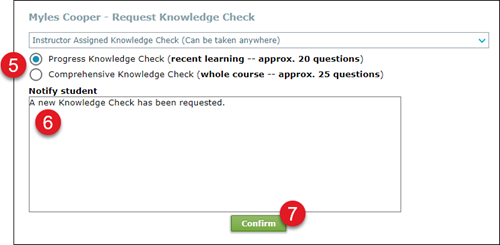 5. Select the radio button to request a Progress Knowledge Check that covers their recent learnings, or a Comprehensive Knowledge Check that covers the whole course.