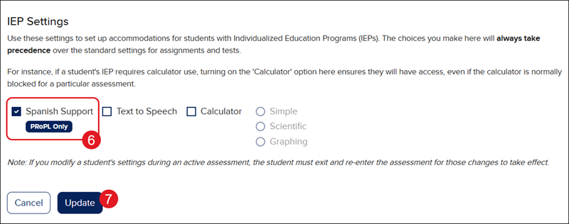 If a student is needing to have the Pearson Review of Progress & Learning (PRoPL) assessment in Spanish, this can be set in the IEP section of their student profile for the class. This option needs to be selected before they begin their PRoPL assessment.