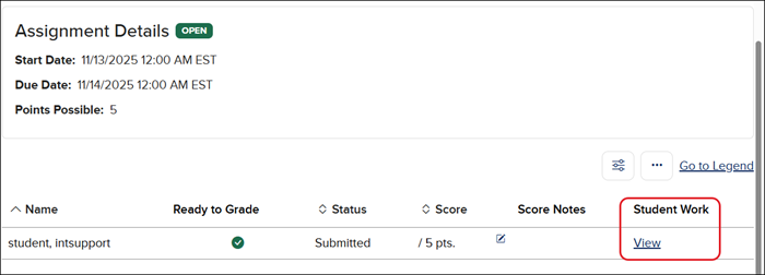 5. Depending on the assignment type, click the View or View Scoresheet link in the Student Work column.