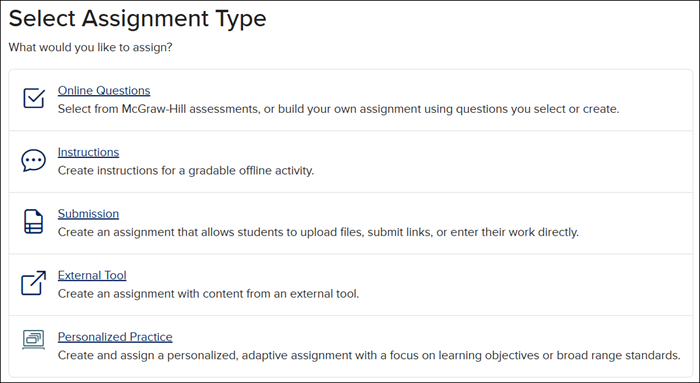 For in-depth instruction on creating Online Questions assignments, refer to the MH Assess - Assign Assessments article.