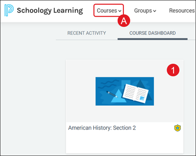 1. On the Course Dashboard, click on the course tile, or select the class from the Courses (A) drop-down.