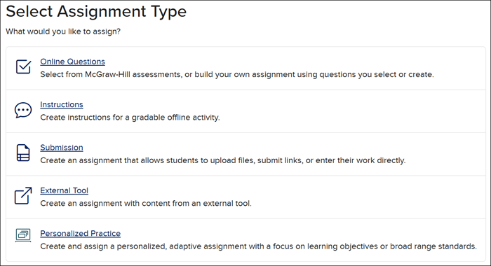 For in-depth instruction on creating Online Questions assignments, refer to the MH Assess - Assign Assessments article.