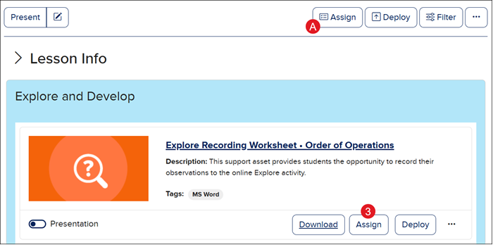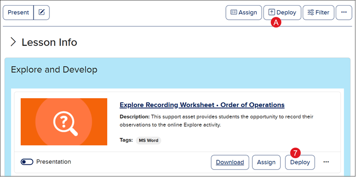 Click the Deploy (A) button at the top-right of the page to assign multiple resources at one time.