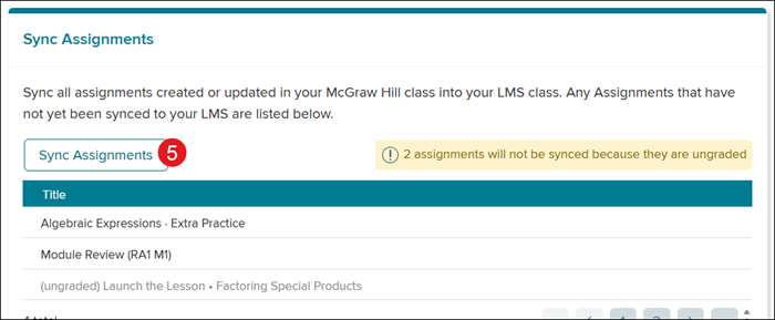 McGraw Hill will automatically check to see if there are any assignments that have not yet been synced to Schoology. These will be listed in the area below the Sync Assignments button.