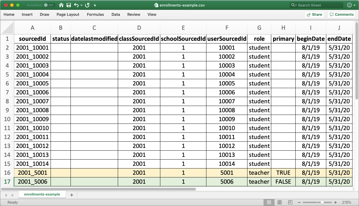 2. Add the primary and secondary teachers to the enrollments.csv file and associate them with the same class. On the enrollments.csv file, enter the value "true" in the "primary" field for the primary teacher and enter the value "false" for each secondary teacher. All of the teachers would be enrolled in the same class by entering the same classSourcedID on the enrollments.csv file.