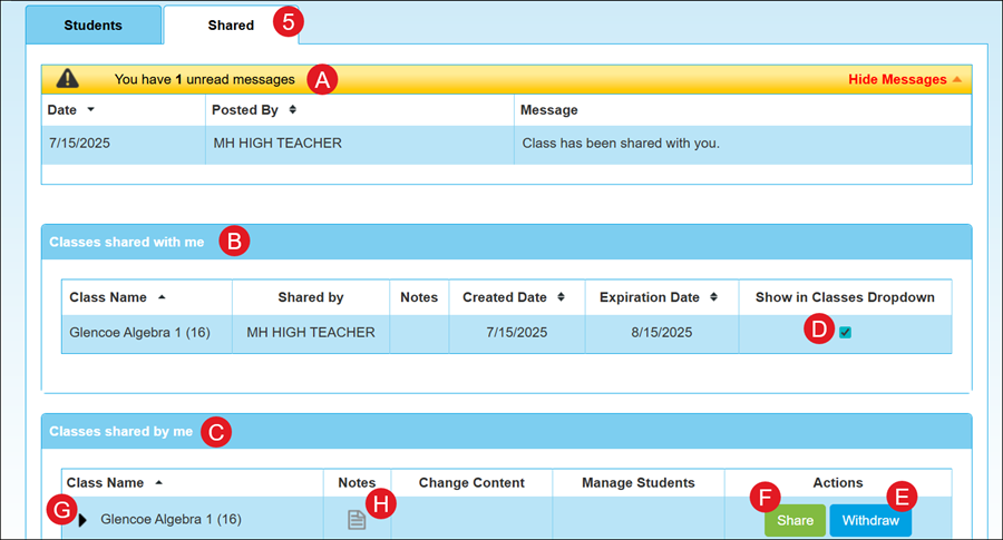 C. Any classes you have shared with the district, school, or another teacher will show in the Classes shared by me section.