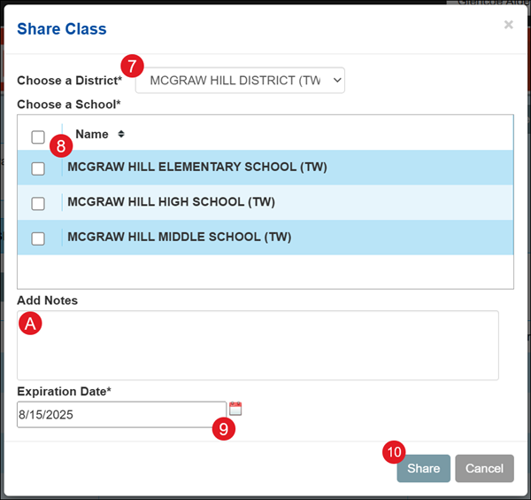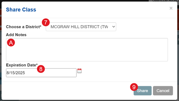 7. On the Share Class pop-up, select a District from the drop menu if you're assigned to more than one.