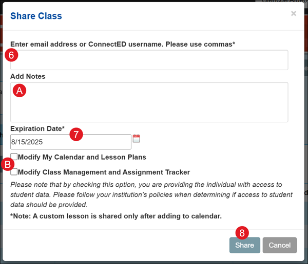 6. On the Share Class pop-up, enter the email address or ConnectED username for the teacher(s) you want to share the class with. Separate each entry with a comma.
