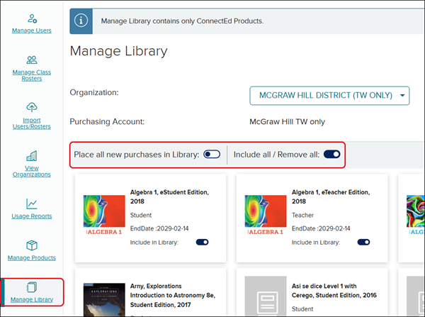 To manage the Library, from the Admin Tools select Manage Library from the navigation menu. Click on the toggle to turn on/off the preferred options: Place all new purchases in the Library and Include all/Remove all. Keep in mind, this is for ConnectED programs only.