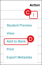 Click on the Options (C) menu icon in the Actions column and click on Add to Bank (D) from the menu.