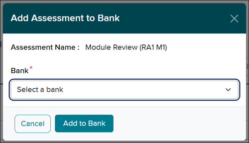 On the Add Assessment pop-up, select a bank you want to add the assessment to and click the Add to Bank button.