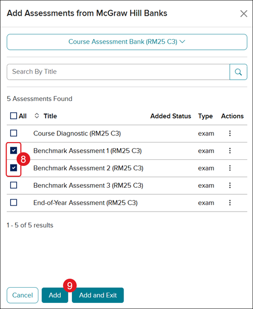 Clicking Add and Exist adds the selected assessments to the bank and closes the assessment panel.