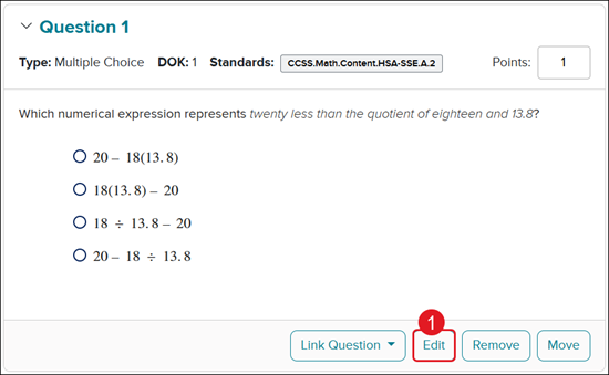 1. To make changes to a question on the assessment, click the Edit button.