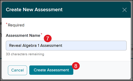 7. On the Create New Assessment pop-up, enter an Assessment Name.