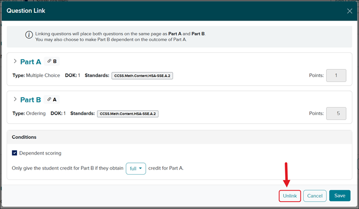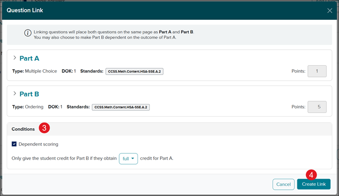 If you want to set Dependent scoring between the linked questions, check the box. You will then need to select full or partial for credit from the drop-down.