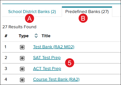 4. The School District Banks (A) tab are were you can locate custom made assessments.