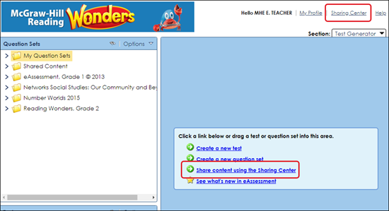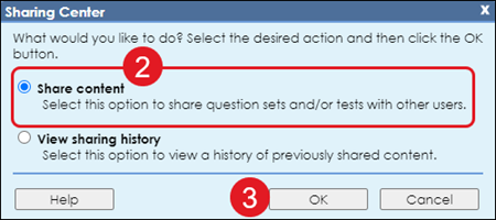 1. Open eAssessment and select Sharing Center at the top right or click the Share content using the Sharing Center link in the Editor pane.