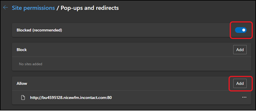 To allow pop-ups and redirects for certain sites while blocking others, toggle on the Blocked (recommended) option. Then, click the Add button next to Allow. Enter the site address in the Add a Site pop-up. Click the Add button.