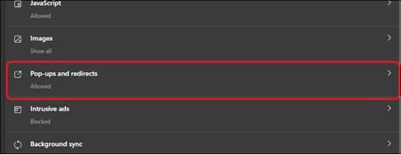 4. Under Site Permissions, click on Pop-ups and redirects.