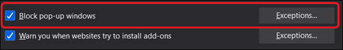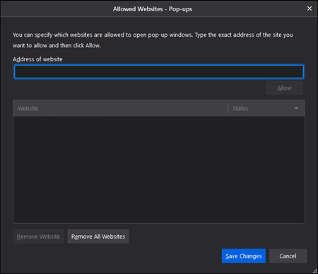 To allow pop-ups for certain sites while blocking others, check the Block pop-up windows option. Then, click the Exceptions button. Enter the web address of the site you would like to allow pop-ups for. Click Save Changes at the bottom.