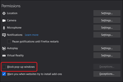 4. To disable the pop-up blocker, under the Permissions section uncheck the Block pop-up windows option.