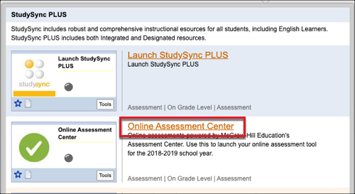 The Online Assessment Center is accessed directly from ConnectED. Once you launch your teacher edition, the Online Assessment Center is accessible from the teacher dashboard as shown in the below image. Reporting for assessments created and launched from the Online Assessment Center is accessible from the Performance Reports section in Admin Tools.