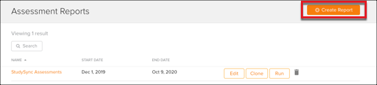 4. On your main Reports page, you can access previously saved assessment reports. To build a new report, select Create Report at the top right.