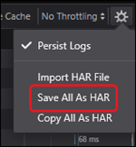 7. After you have reproduced the issue, click the gear icon on the Network tab again and select Save All As HAR from the menu.