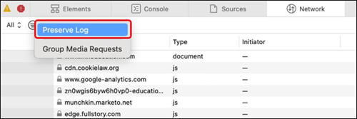 10. Select Preserve Log in the pop-up menu.