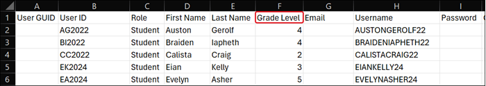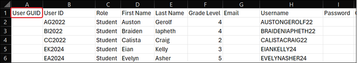 If you left the username and password columns blank, the file contains the system-generated usernames along with a temporary password for each account.