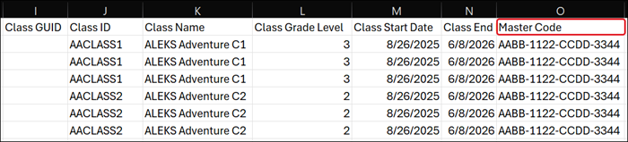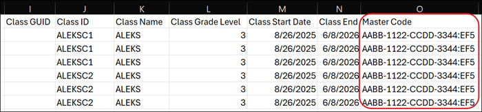 For some classes, such as ALEKS (3-12) and ALEKS Adventure, you also need to add a Resource Code. The Resource Code will be an additional code to add at the end of the Master Code.