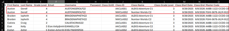 4. Copy the Student GUID, Student ID, First Name, Last Name, Grade Level, Email, and Username for each student you want to add to the class (columns A-G).