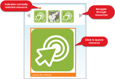 On select sections of the text, resources that correspond to the current lesson will also be available. Use the arrows to move through the resources available. Click on the resource icon to display the resource in the large window below the listed resources. Click on the larger icon to fully launch the resource.