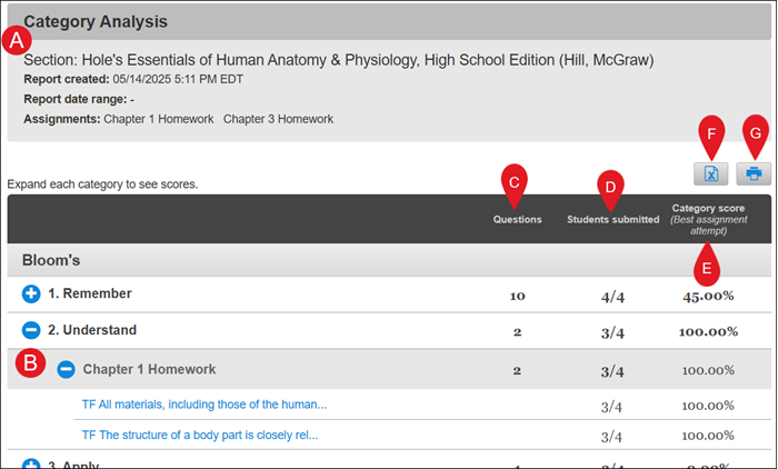 A. Category Analysis – Provides the section you currently are in, the date and time of report creation, the report date range (if selected), and the selected Assignment(s).
