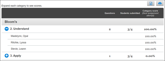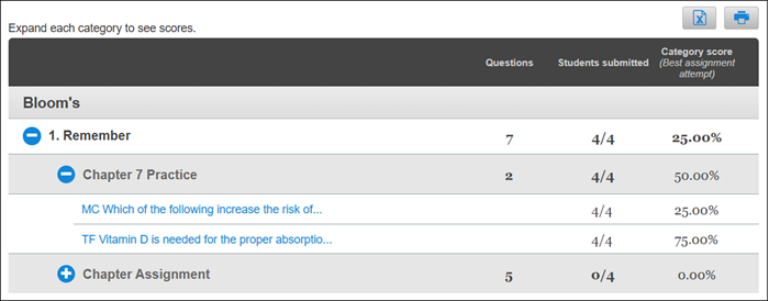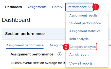 Use the K‑12 Connect category analysis report to evaluate student performance by category or learning objective.