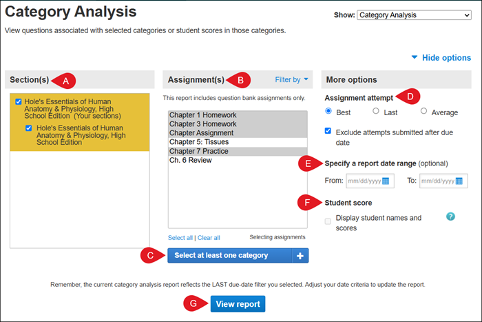 C. Select at least one category – Select at least one category to use in order to evaluate students' performance. These categories vary based on what section and assignments you choose. A category or category group is only available when a selected assignment contains a question with content related to this category or group.