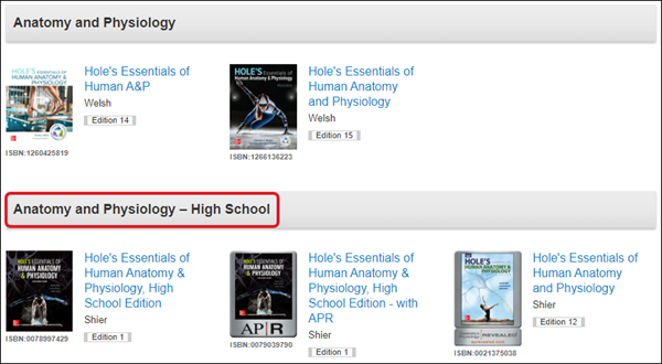 If you have associated the wrong course with your Connect account, use the steps in this article to locate and assign the correct one. These courses will be flagged with "AP" or "High School" at the end of their titles. For example, Hole's Essentials of Human Anatomy & Physiology is available under the Anatomy and Physiology and A and P - High School courses. Advanced Placement Student Codes will only work with the course-flagged High School.