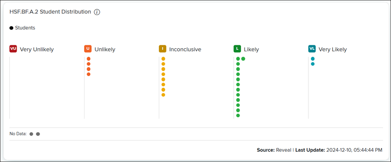 Click on the third ring to view the Student Distribution panel. This represents the probability that the student or classroom is proficient in the standard or skill based on questions answered in ALEKS, Redbird, and/or Reveal.