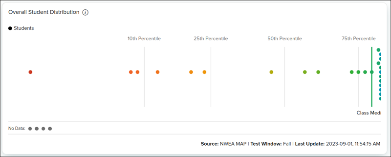 The dots in the Overall Student Distribution panel represent each student and the distribution of proficiency in the class. The admin can quickly see where the median of the class performance is, and which students are outliers.