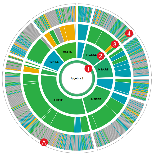 • The fourth ring also pulls from Reveal Math, ALEKSRedbird, and Number Worlds, data and separates each of the standards from the third ring into component skills.