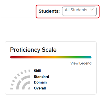 To view individual student data, click on one of the dots below the sunburst graph in the panel, or by selecting the student’s name from the Students drop-down above the Proficiency Scale panel at the top-right.