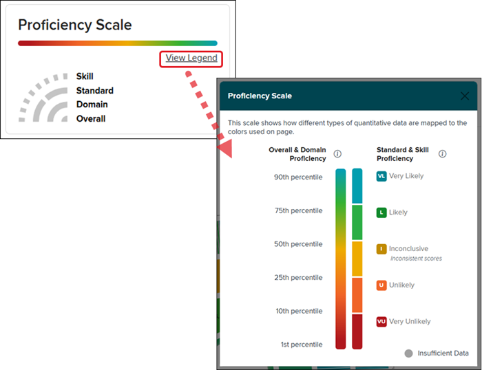 Click on the View Legend the in the Proficiency Scale panel located in the top-right corner of the graph to view a color gradation that shows how different types of quantitative data are mapped to the color scale used in the charts.