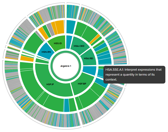 • The fourth ring of the graph only presents data if there are at least five questions answered by the students for a particular skill. The third ring will fill in as data is generated from the skills underneath that standard.