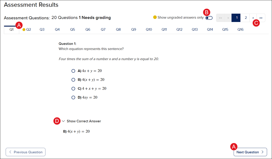 D. Click the arrow to show/hide the Correct Answer for the question being viewed.