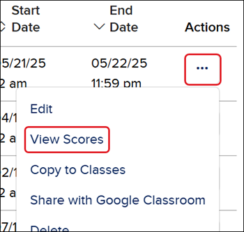 or click on the Options menu icon in the Actions column and click on View Scores from the menu.