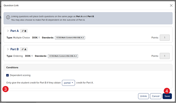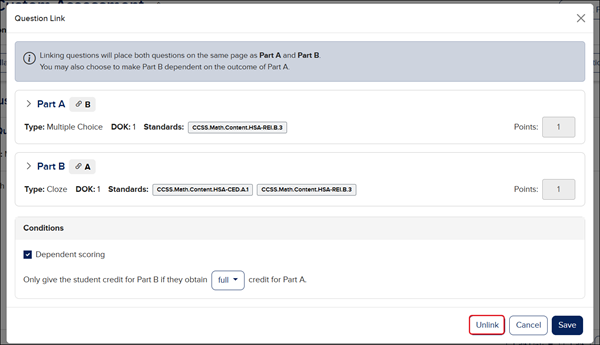 If you want to set Dependent scoring between the linked questions, check the box. You will then need to select full or partial for credit from the drop-down.